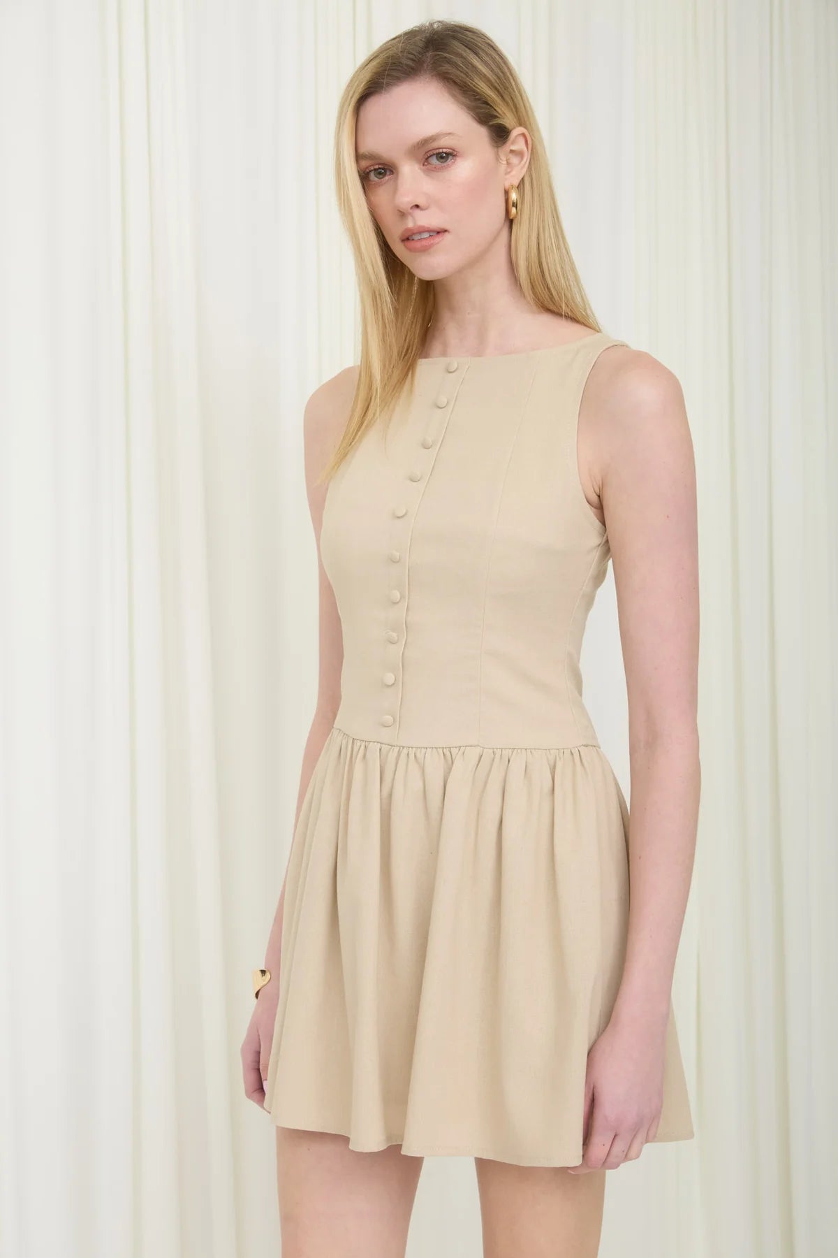 BOAT NECKLINE SLEEVELESS BUTTON DOWN NON-FUNCTIONAL BUTTONS BACK ZIPPER FLOUNCE SKIRT LINED SOLID LINEN BLEND MINI DRESS