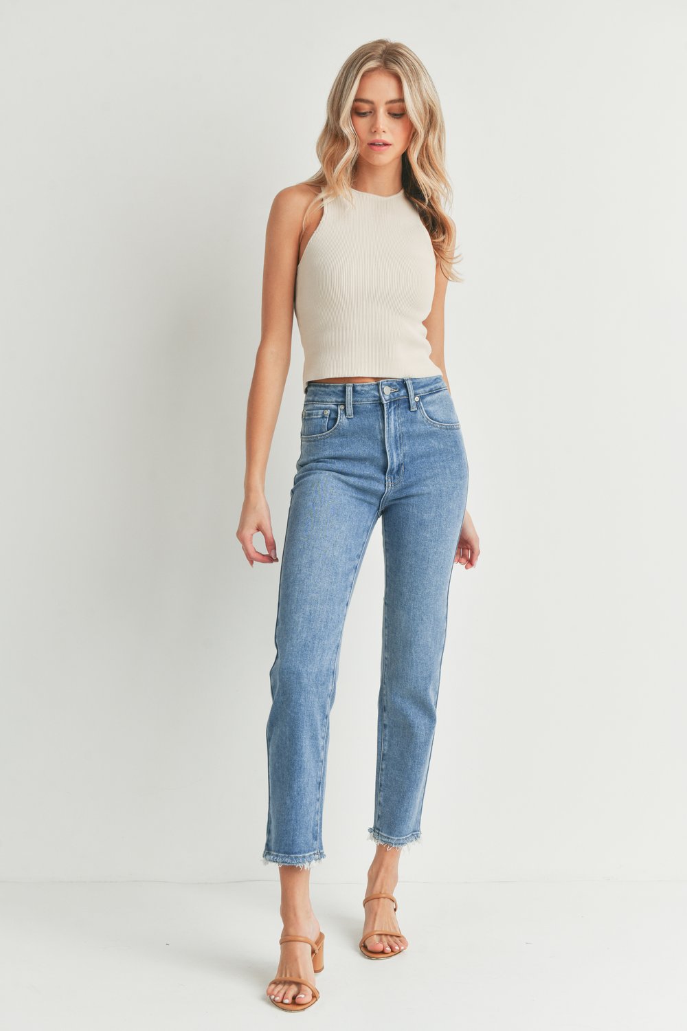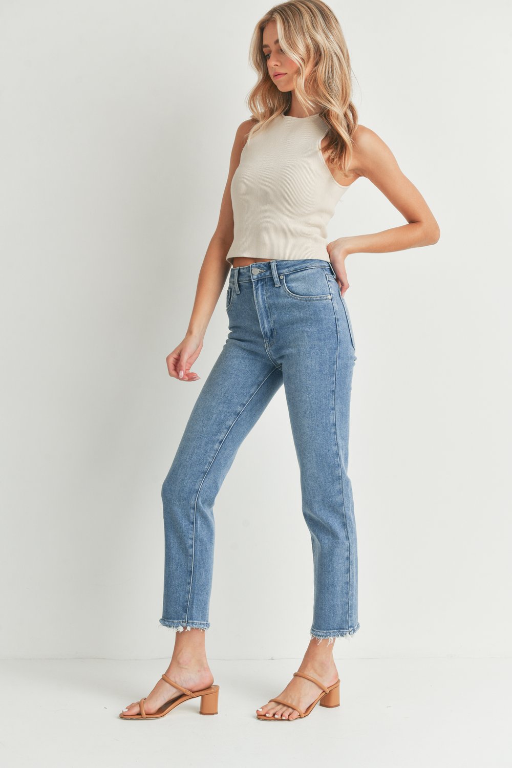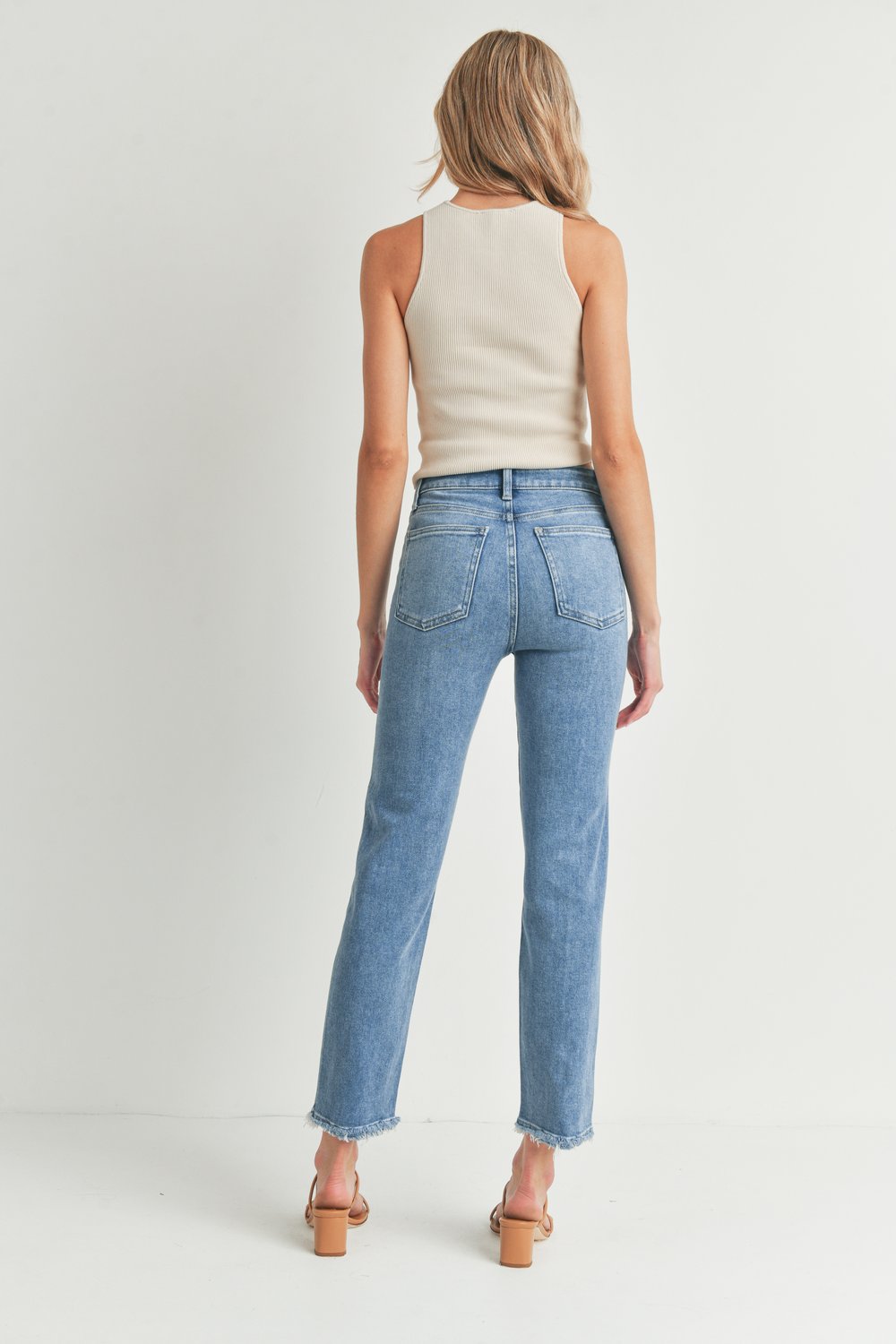 A classic straight jean with subtle fraying around the hems. This mid-rise pair is a four-season