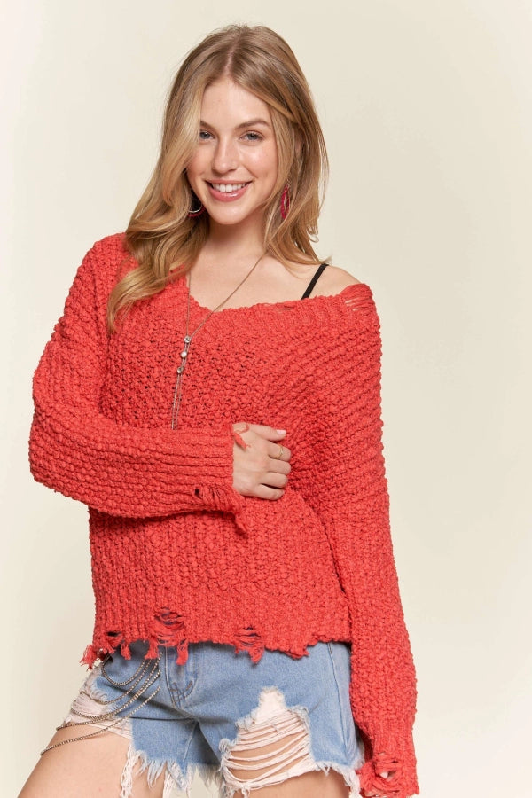 DISTRESSED BOAT-NECK KNIT SWEATER