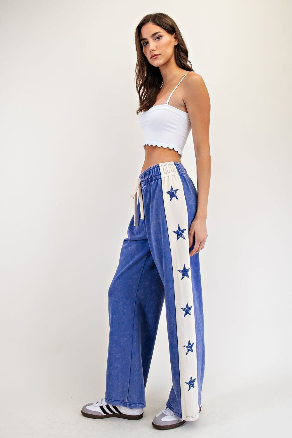Colorblock joggers featuring a star print on the side panels, an elastic waistband with a drawstring, and a relaxed fit for a bold yet comfortable style.