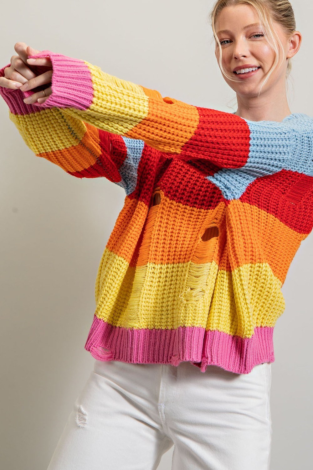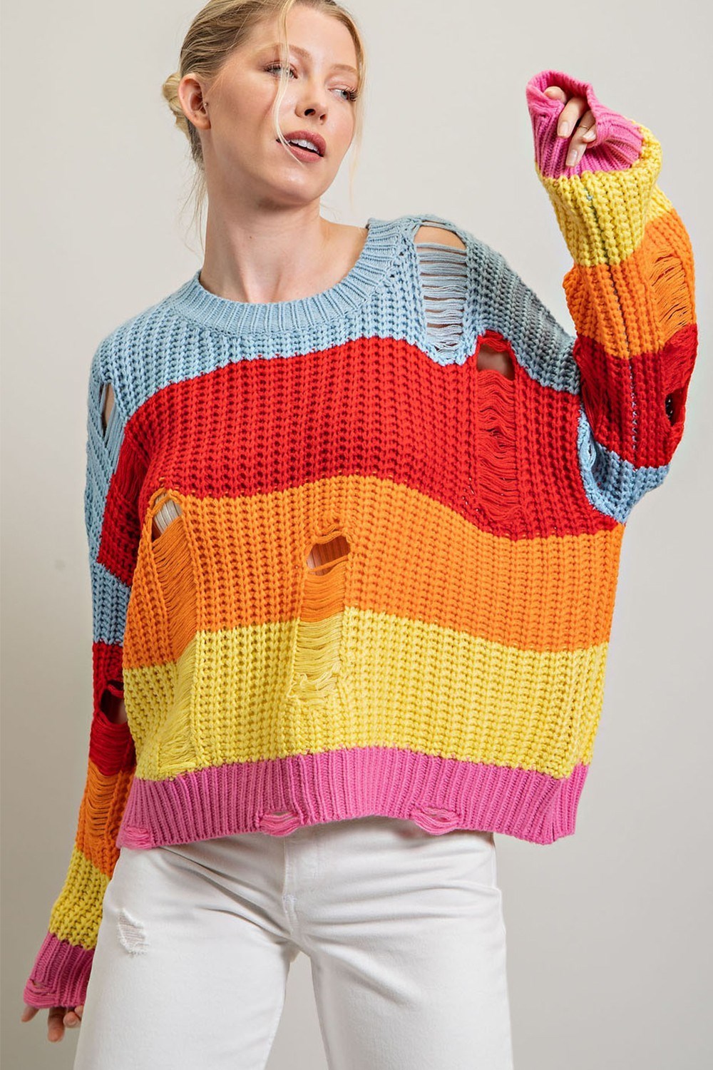 Striped crochet knit sweater featuring an oversized body, distressing going throughout, and a ribbed rounded neckline.