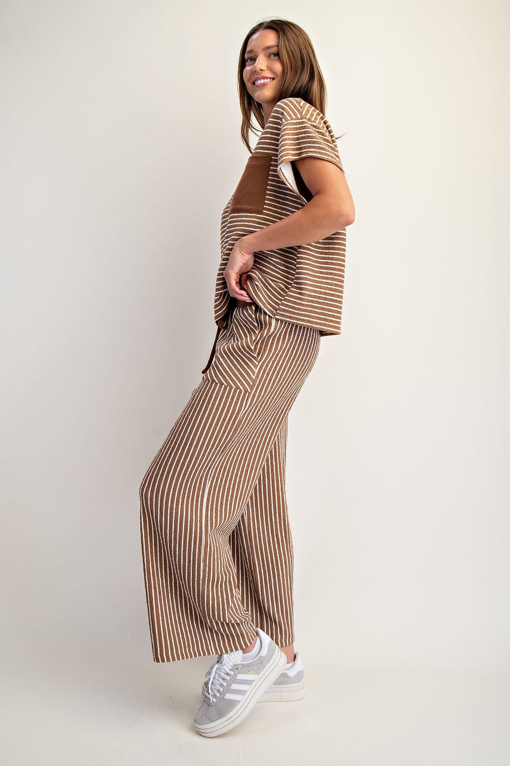 Product Detail: These striped knit pants feature a soft textured feel with a relaxed straight leg silhouette, a contrast elastic waistband with an adjustable drawstring, and side hip pockets for an easygoing yet elevated lounge look.